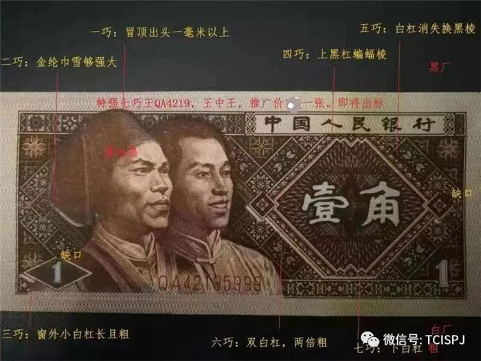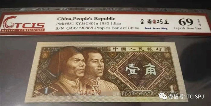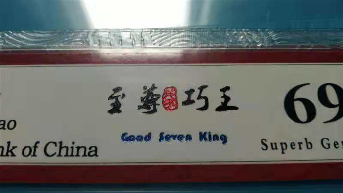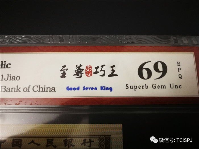 2)至尊“柒”巧王,為什么標名中間帶含“柒”字紅色特殊印章,首先為設(shè)計理念:常規(guī)來說紙幣收藏界俗稱8001七巧板,說明七個位置巧妙,至尊“柒”巧王不僅僅七個地方巧妙!再者中國人喜歡無“4、7”所以名字不能念“七”。為了將標識名稱大眾化,隱“七”保王。把“七”巧妙轉(zhuǎn)化為中國元素:把大寫中文“柒”字以紅色印章顯示再呈現(xiàn)在相應(yīng)位置上,突出重點“巧”。該圖形設(shè)計在所有國評評級公司中是很好的,旨在弘揚中國傳統(tǒng)文化,采用中國傳統(tǒng)文字。印章“柒”具中國特色,采用大師級手繪加鏤空設(shè)計,端莊大方、獨樹一幟,同時具有極強防偽功能。